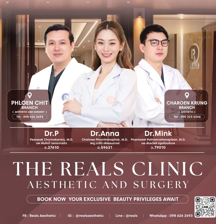 ที่ Reals เราให้บริการด้านศัลยกรรมตกแต่งและดูแลผิวพรรณ โดยยึดหลักการดูแลที่คำนึงถึงความปลอดภัย ความเหมาะสม และความแตกต่างของแต่ละบุคคล การรักษาทุกขั้นตอนอยู่ภายใต้มาตรฐานทางการแพทย์ พร้อมทีมแพทย์ที่ให้คำแนะนำอย่างเข้าใจ